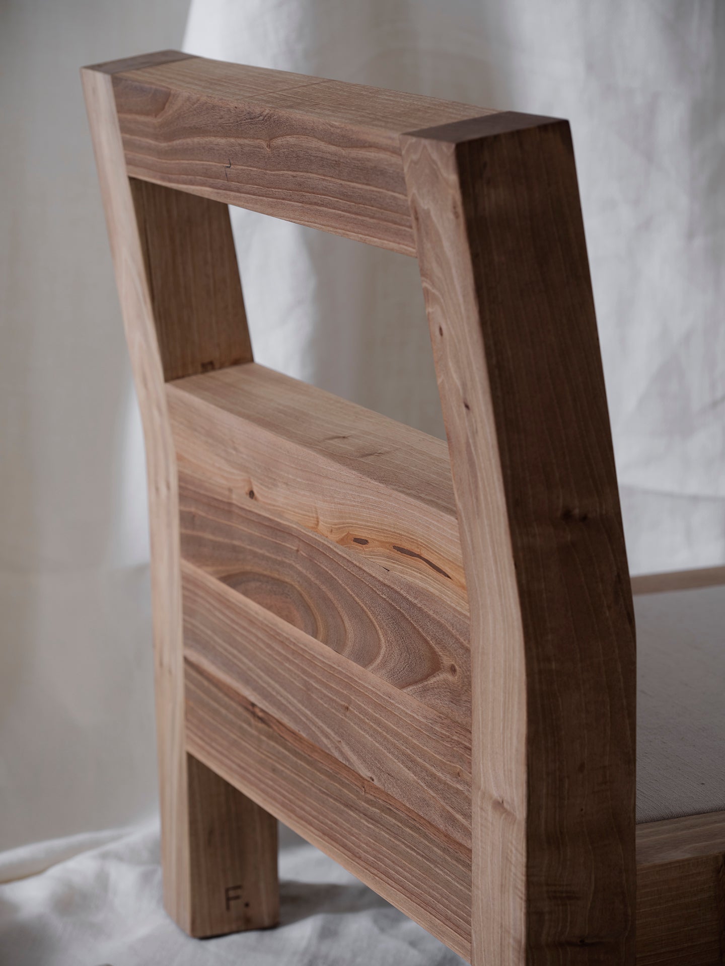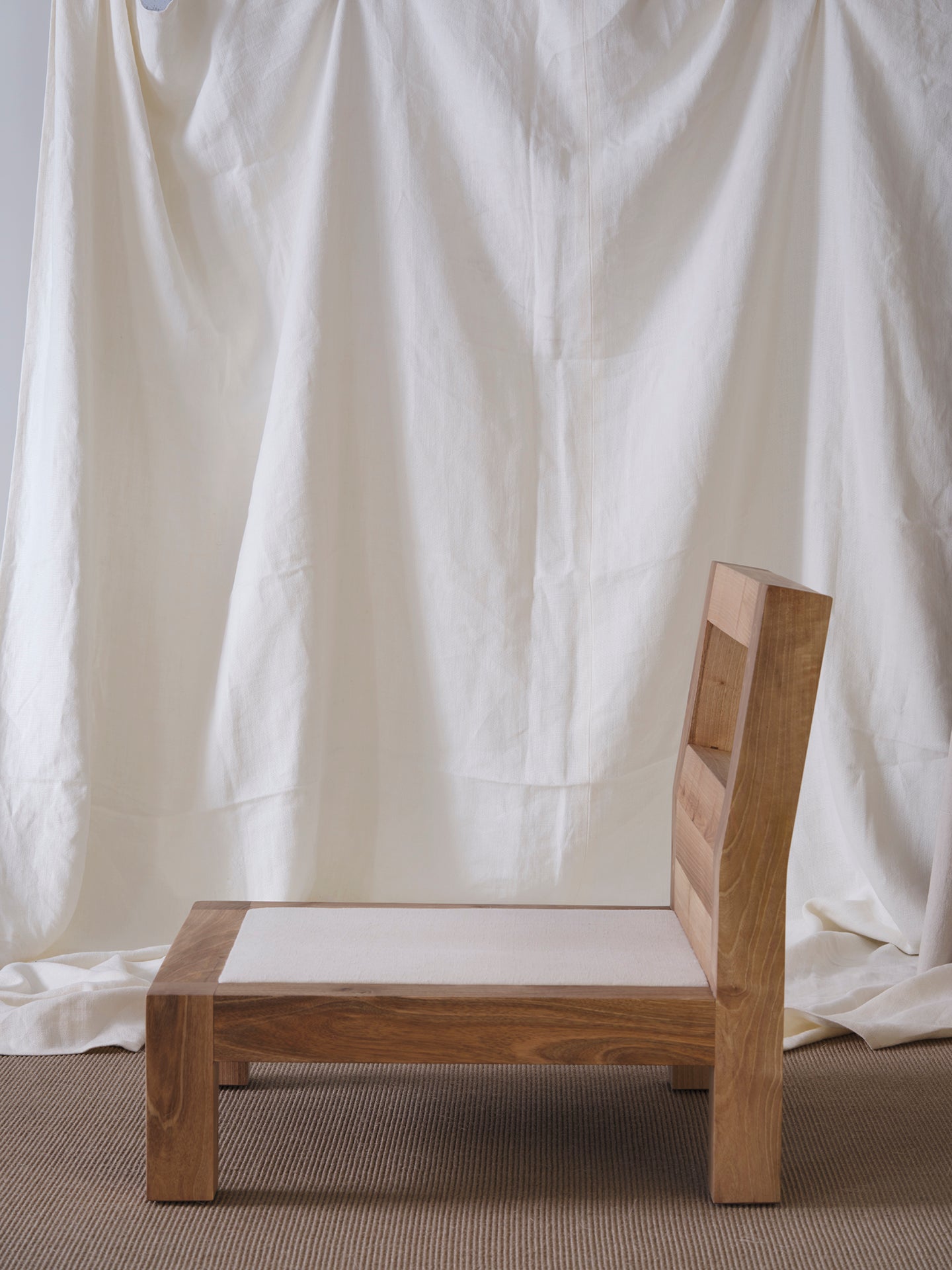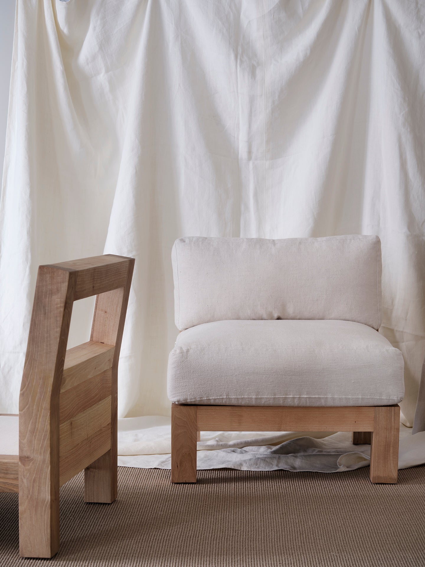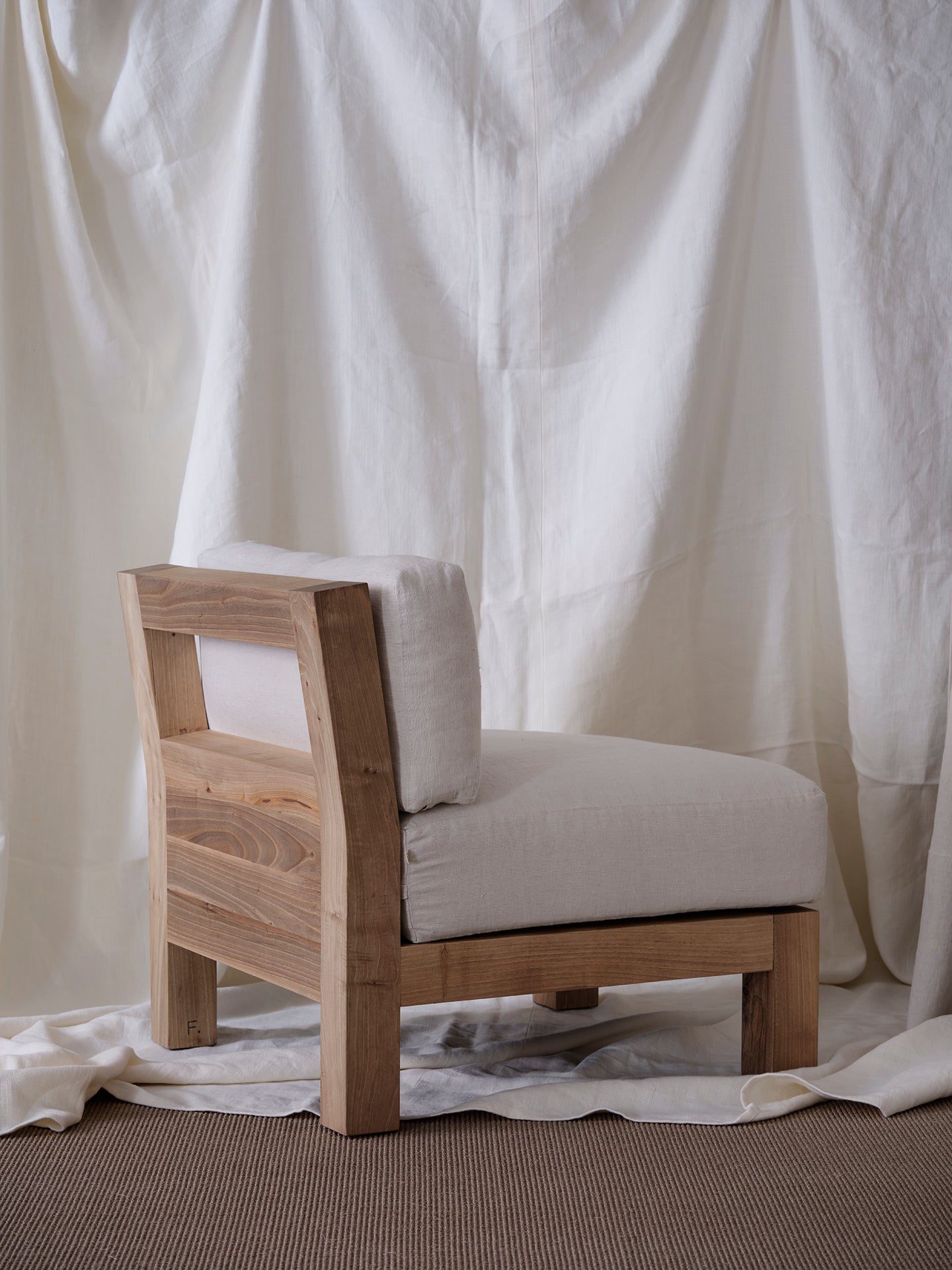 Butaca con estructura en madera maciza de acabado mate. Asiento y respaldo en algodón relleno de foam de fibra y goma espuma recubierto por edredón de plumas. Funda exterior en tela de lino 100% - 460 grs/m2.