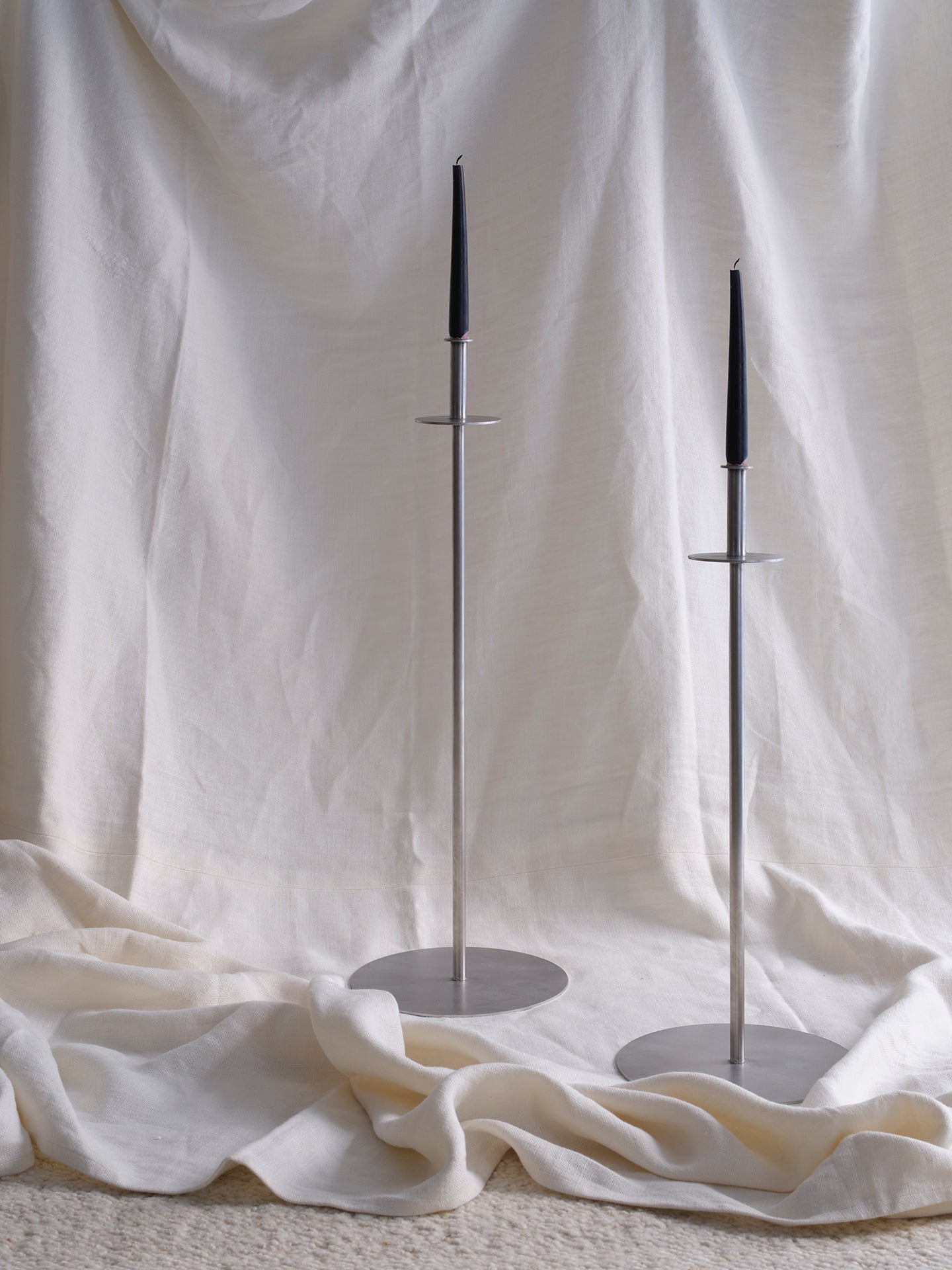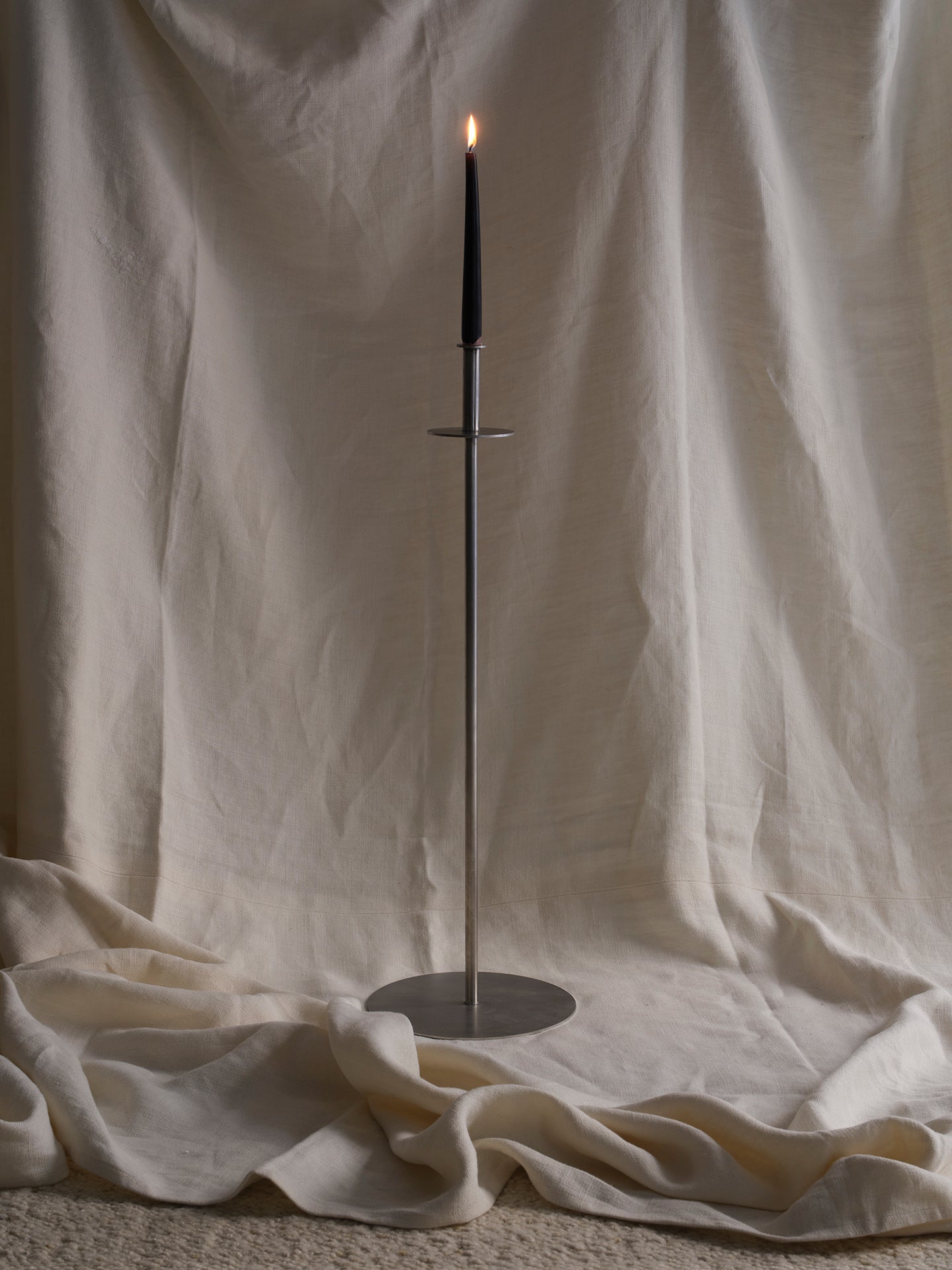 Candelabro de suelo de una sola pieza en acero inoxidable de acabado cepillado.