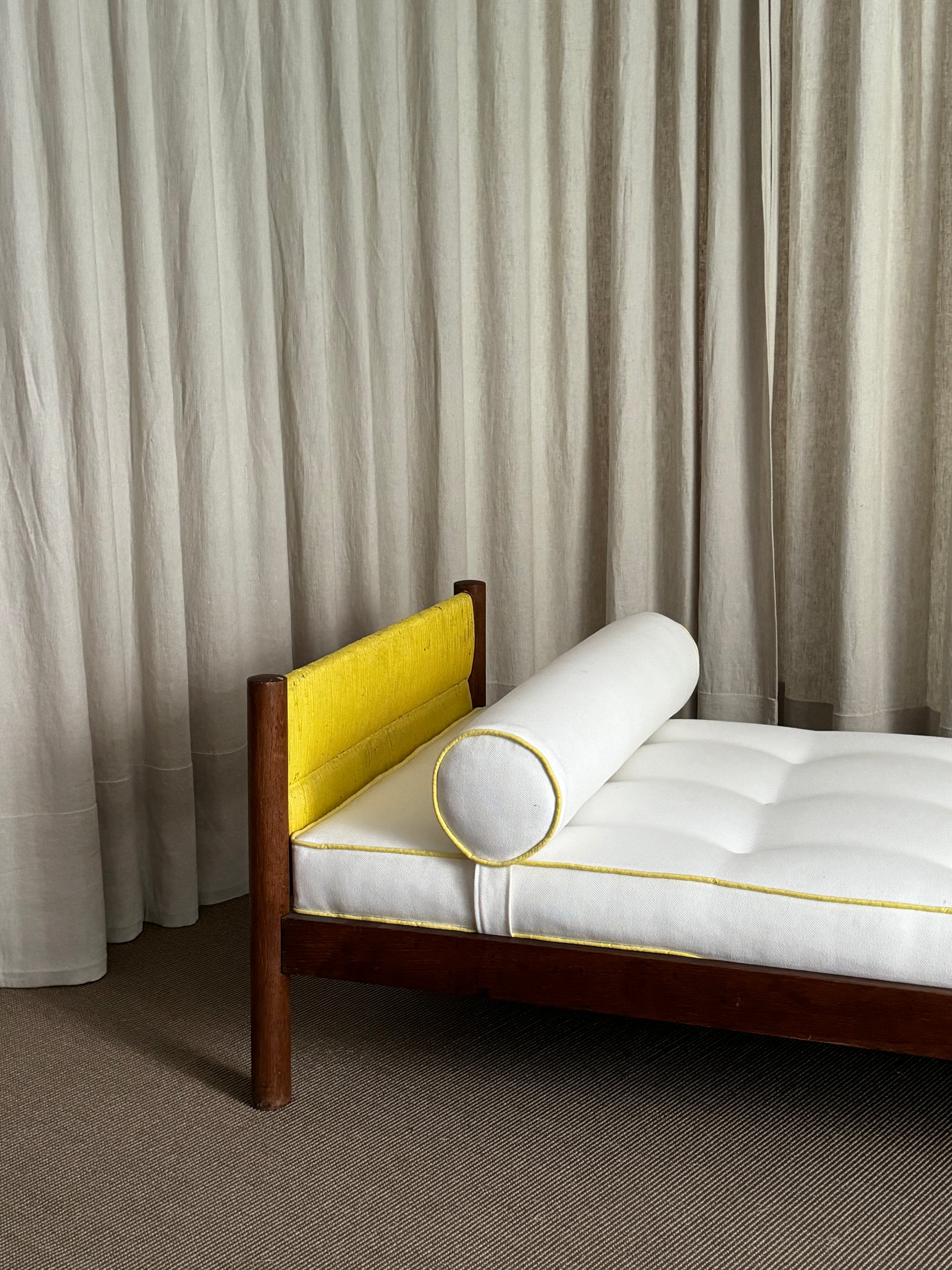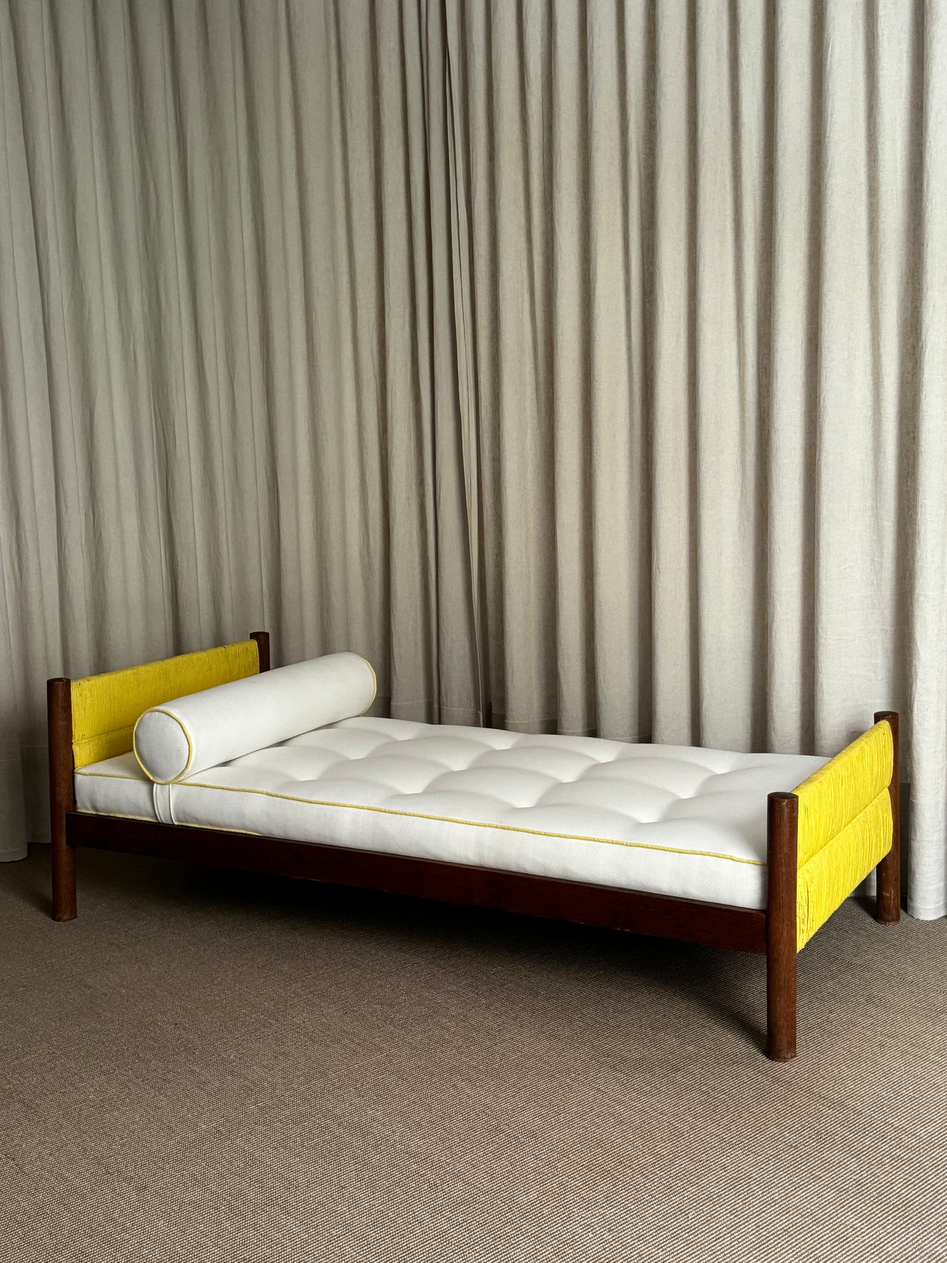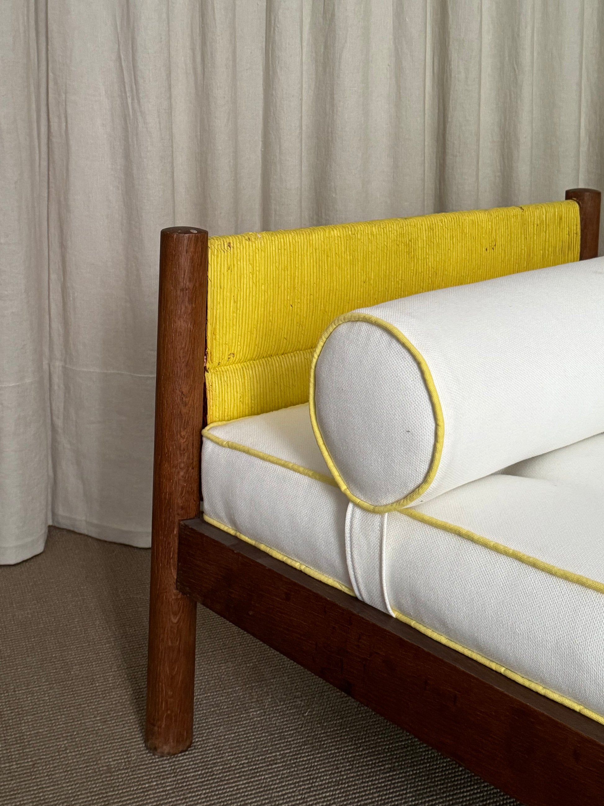 Daybed con estructura y madera combinada con ratán pintado en color amarillo. Almohadón de asiento tapizado en color blanco roto y vivo en color amarillo. Diseño de Charlotte Perriand. Francia, años 1950s.