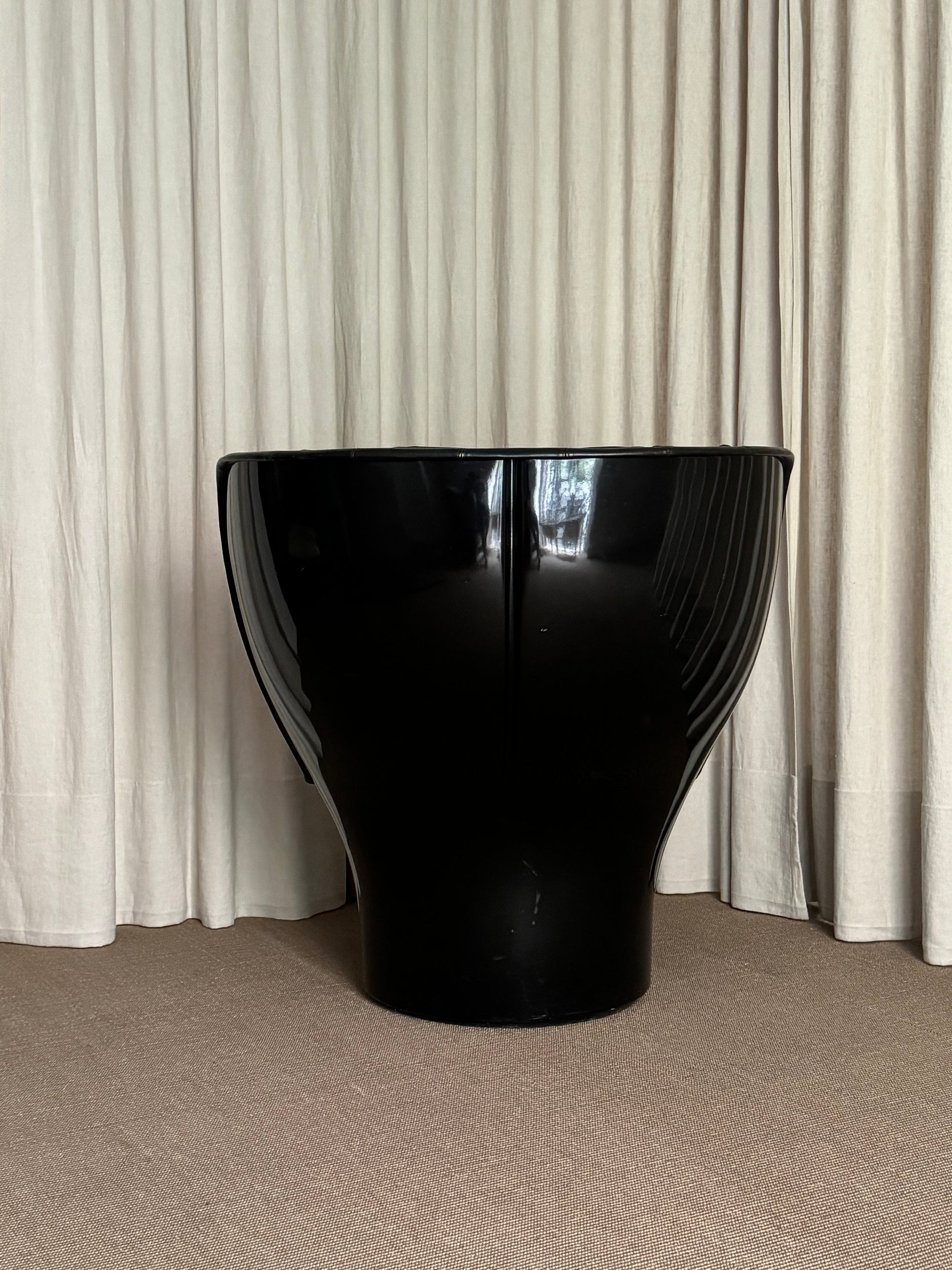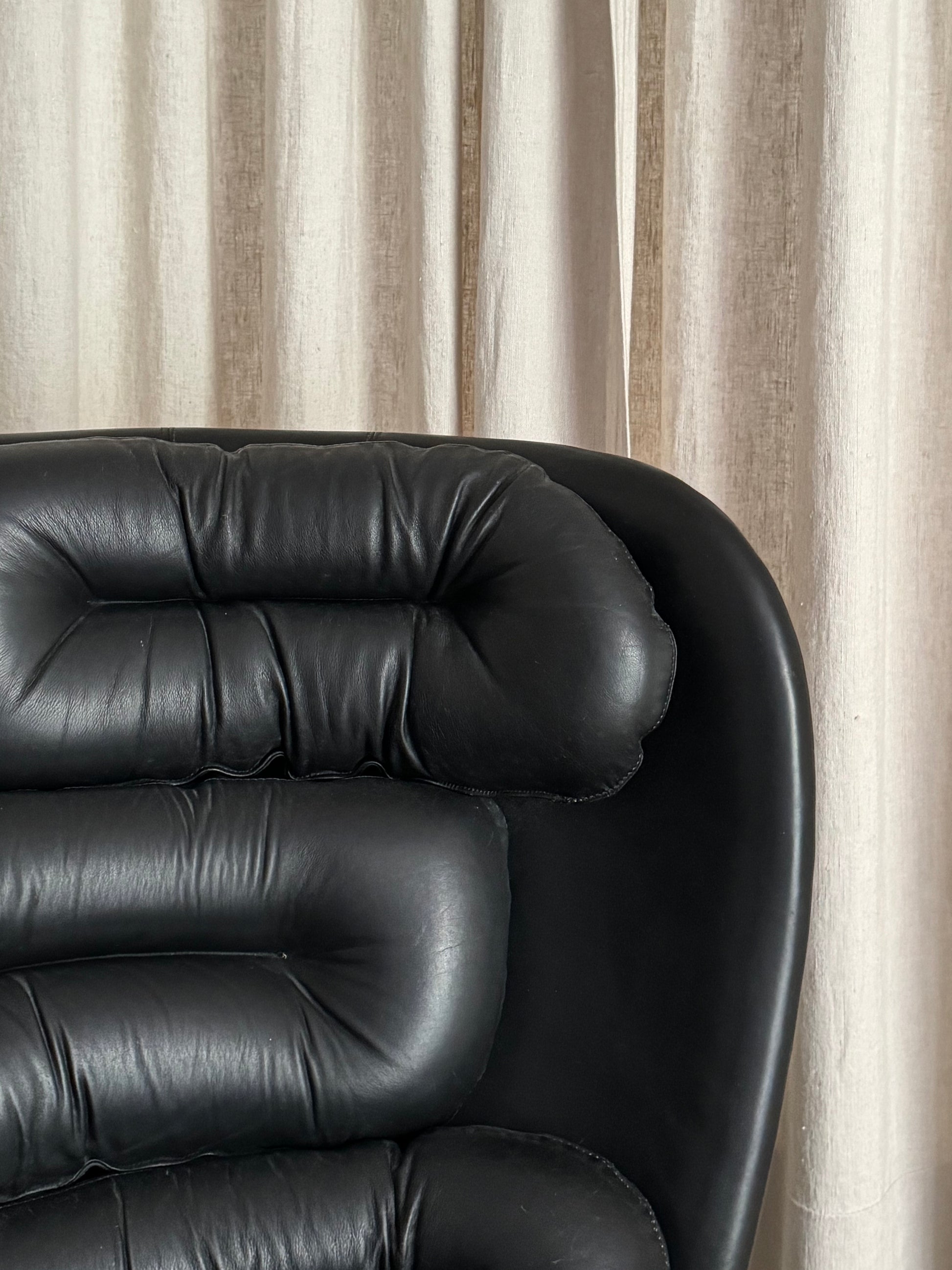 Descripción: Sillón de base giratoria con estructura en fibra de vidrio color negro. Asiento y respaldo en piel negra acolchada.
