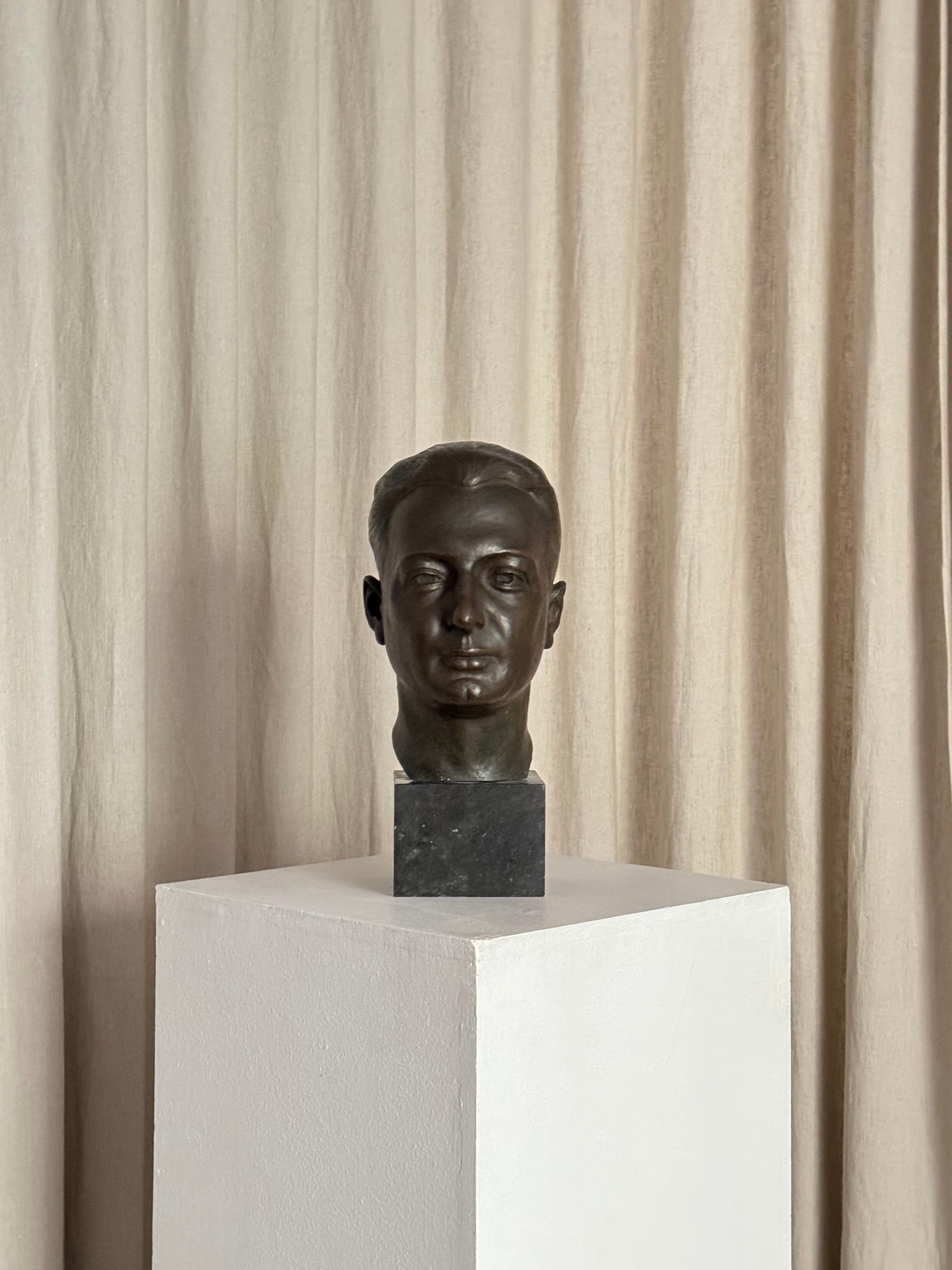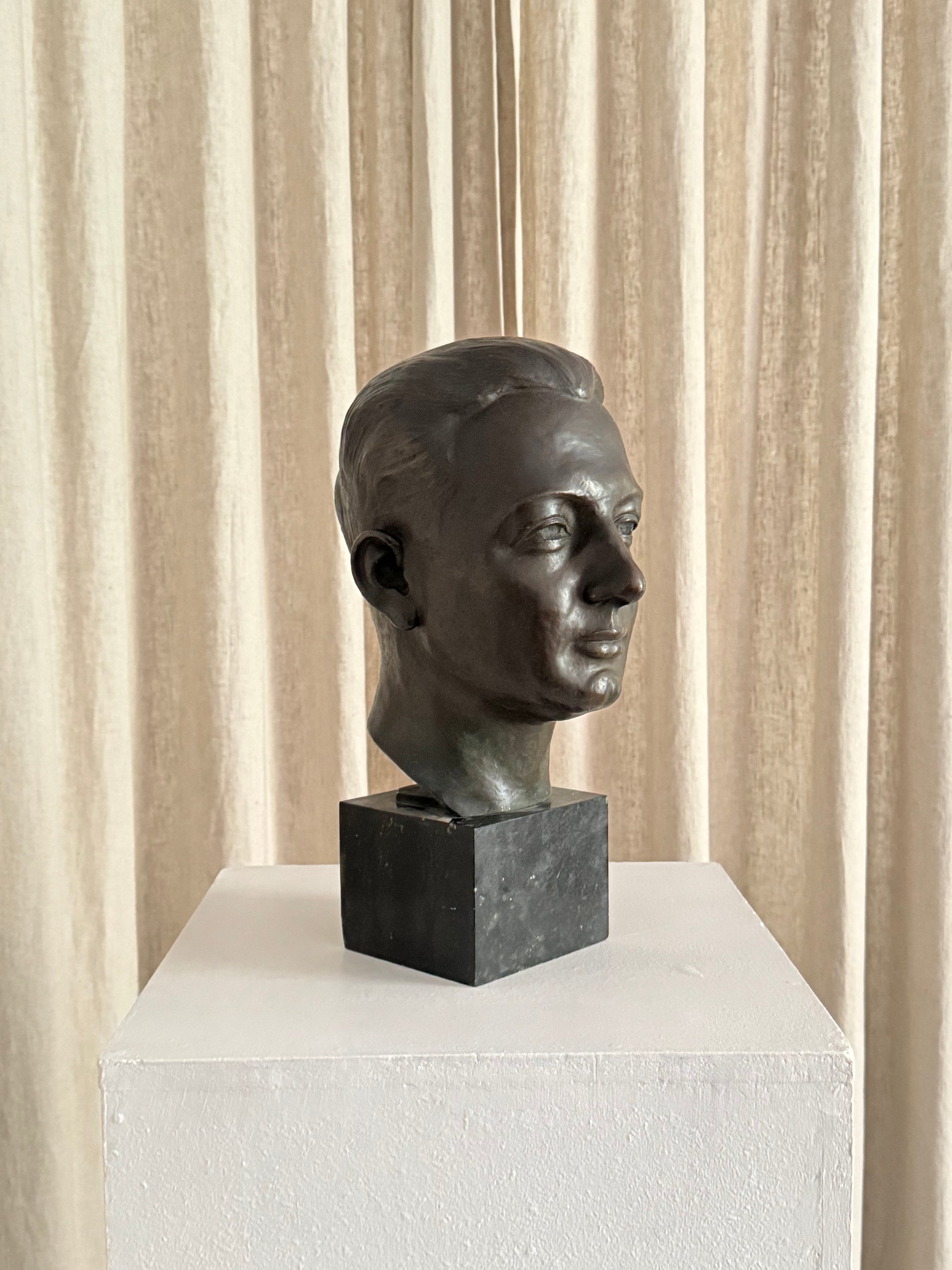 Escultura “Testa Virile” de cabeza de hombre en bronce con base en mármol negro. Autora Gemma Pero. Italia, 1930.