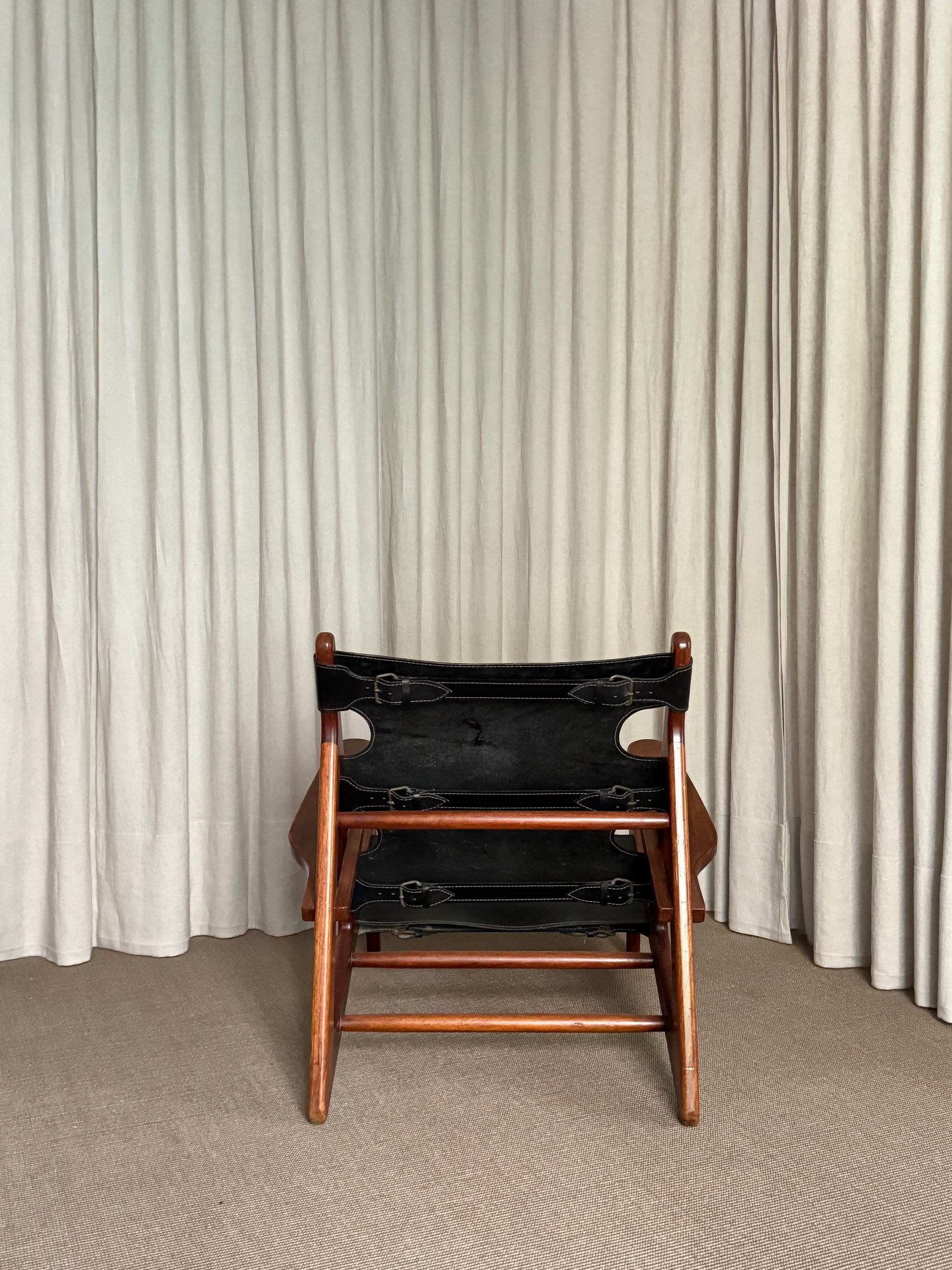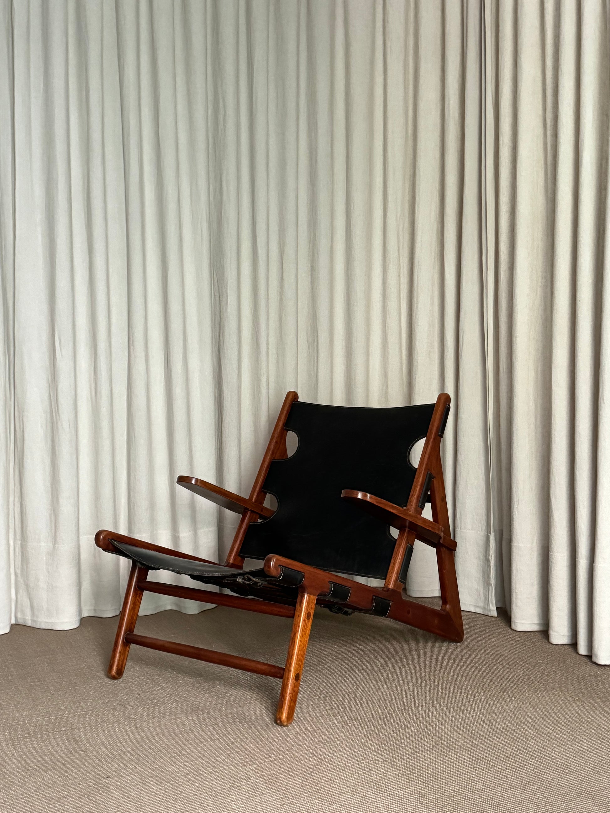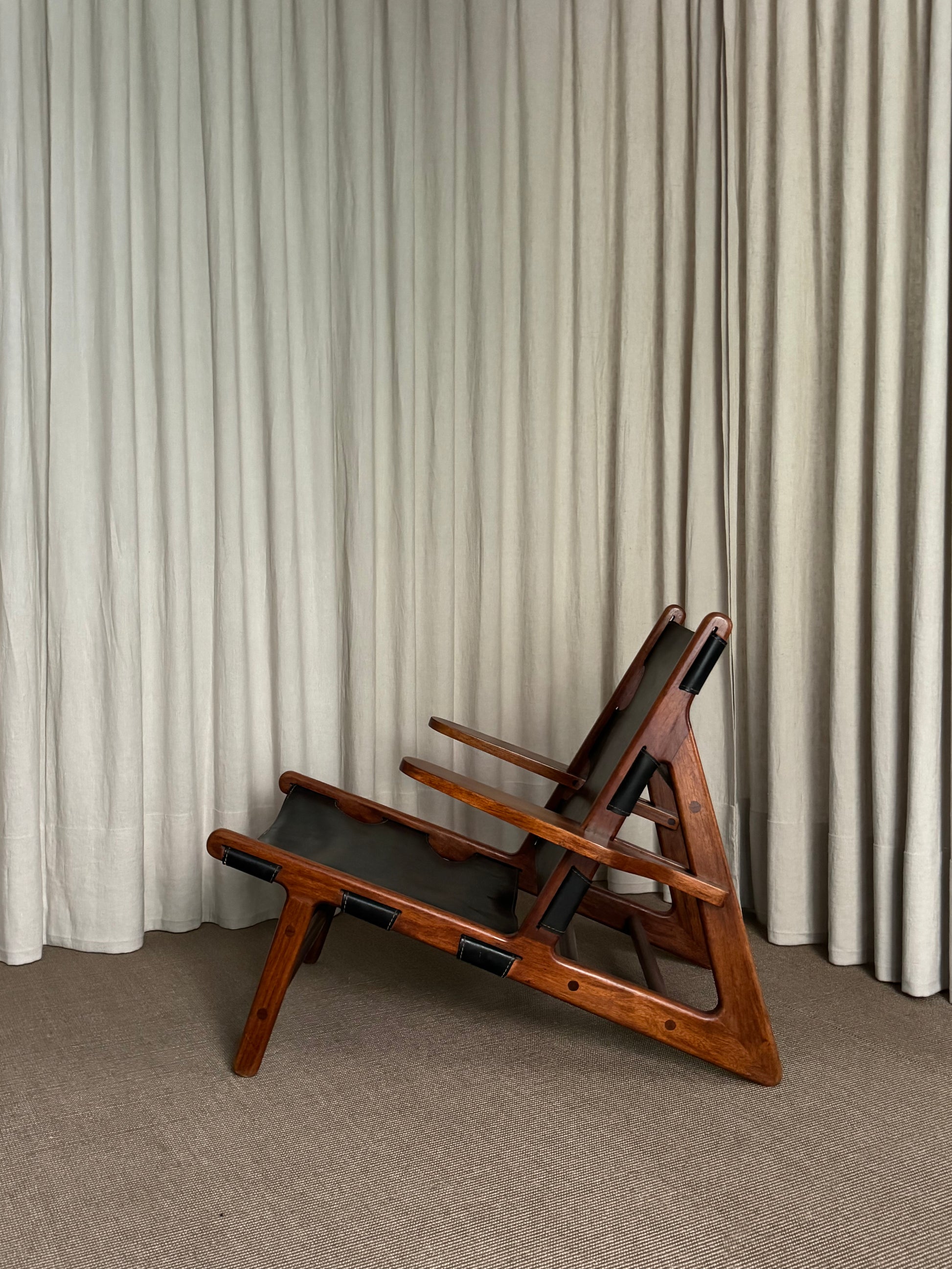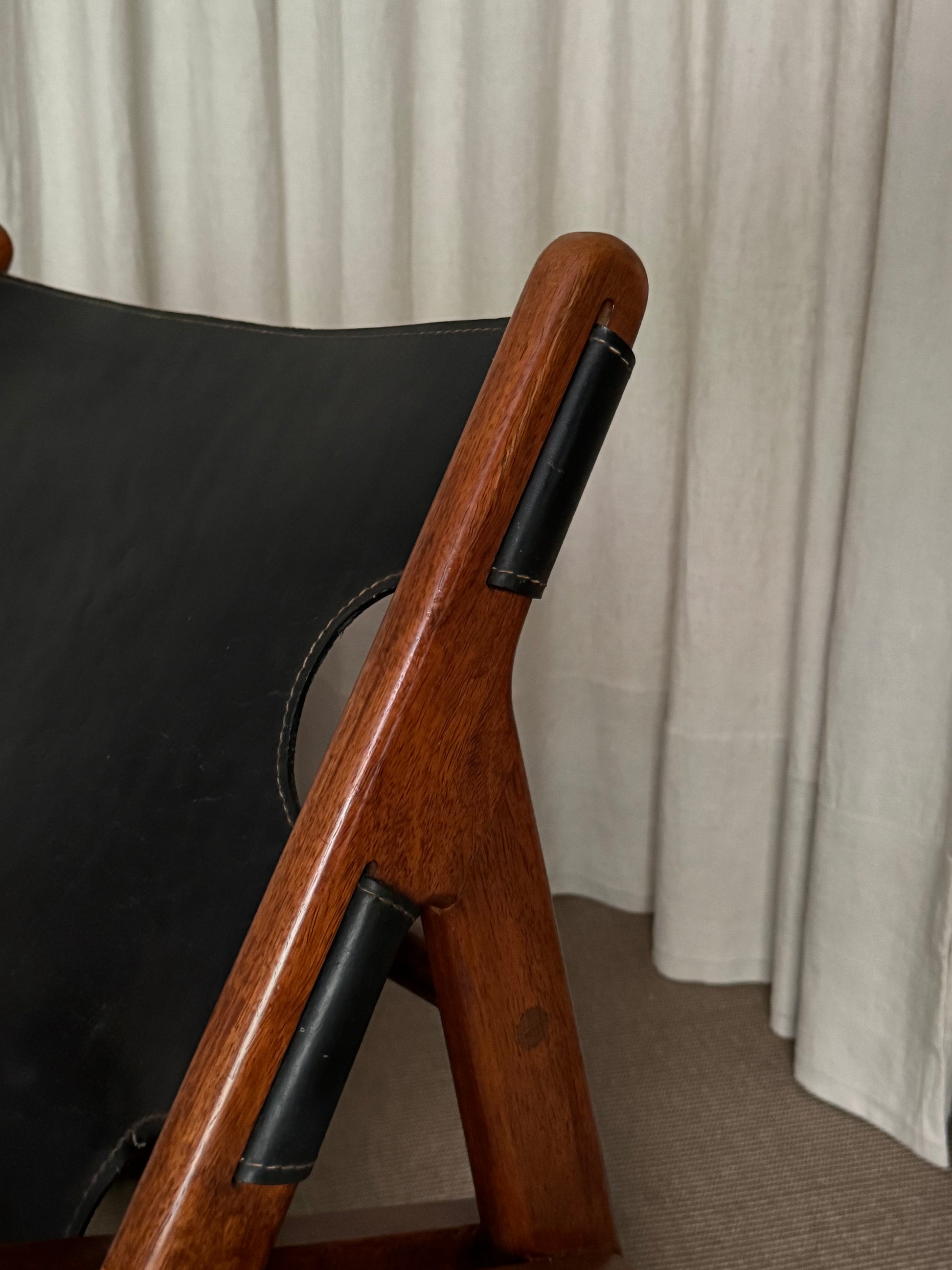 Butaca modelo “Hunting Chair”, 1ª edición con estructura de madera teca. Asiento y respaldo en piel color negra. Diseño de Borge Mogensen. Dinamarca, años 1950s.