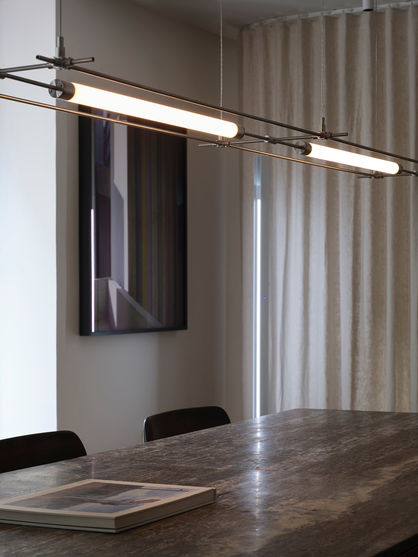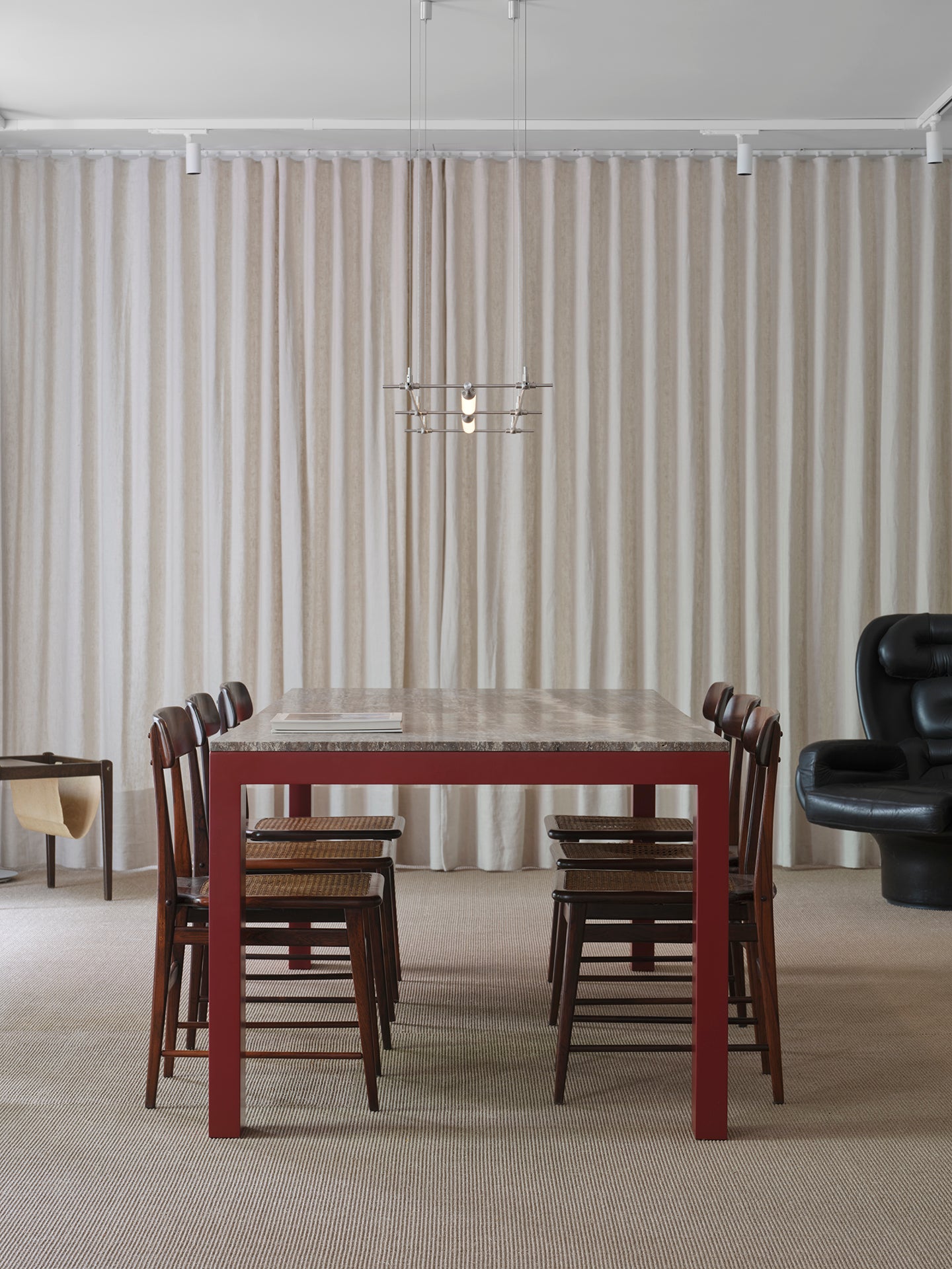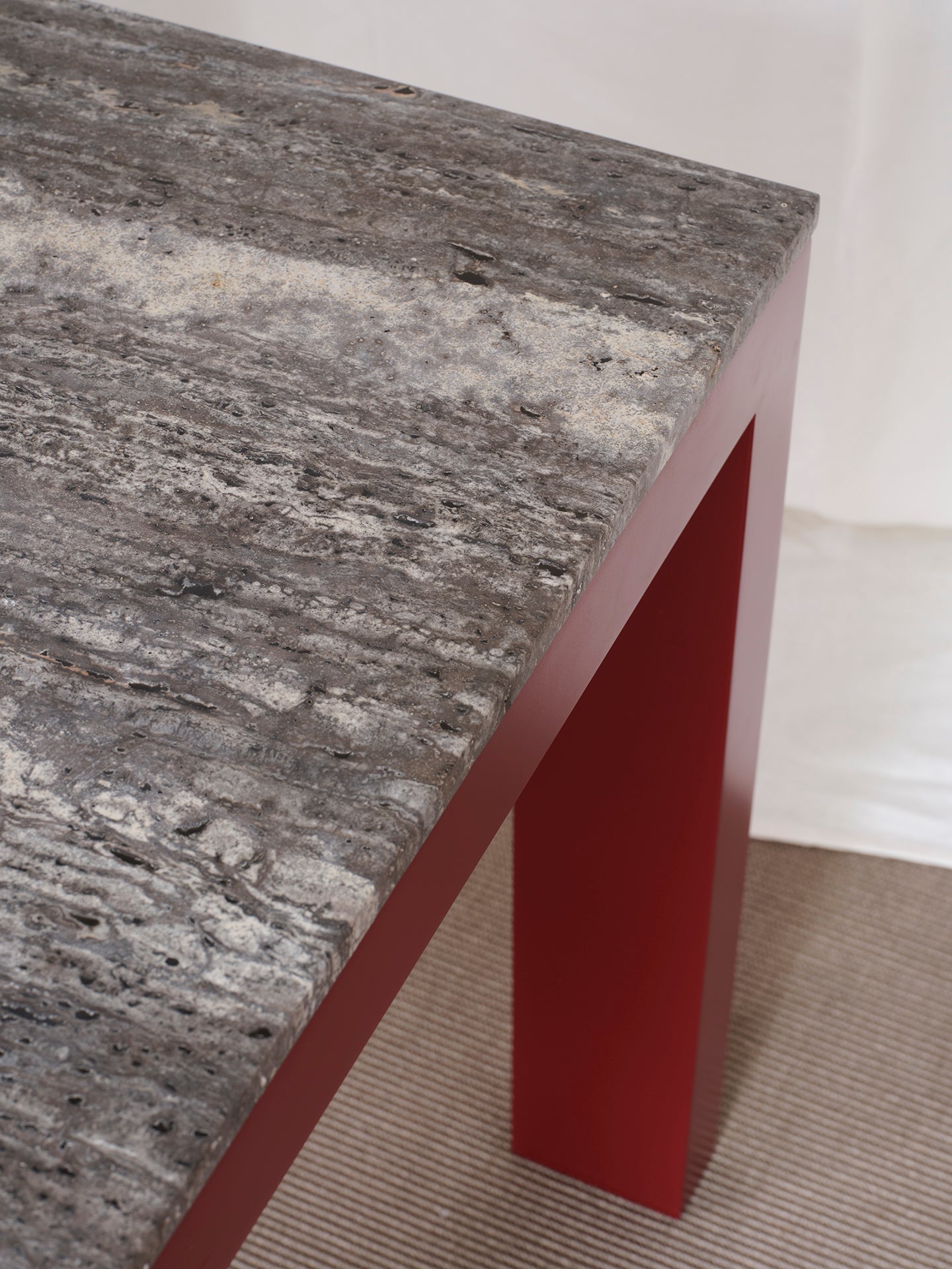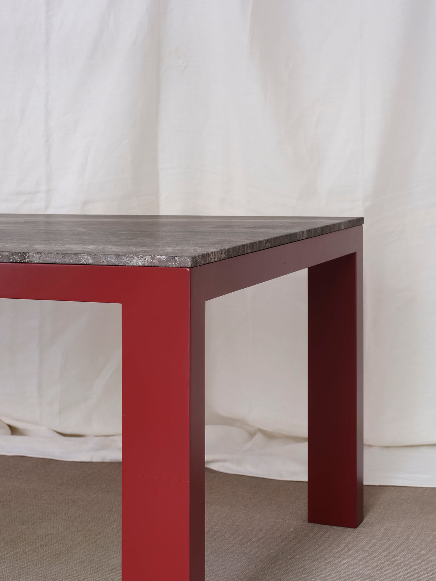 Mesa de comedor de formato rectangular con estructura de madera reforzada y cuatro apoyos en esquinas. Sobre superior en piedra con acabado apomazado dividida en dos partes.