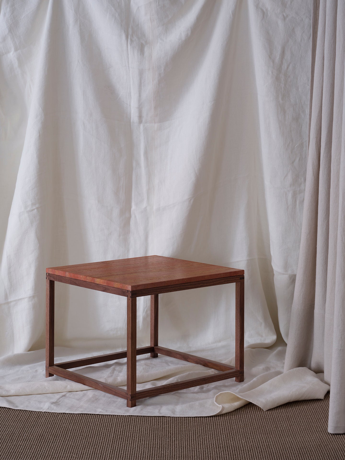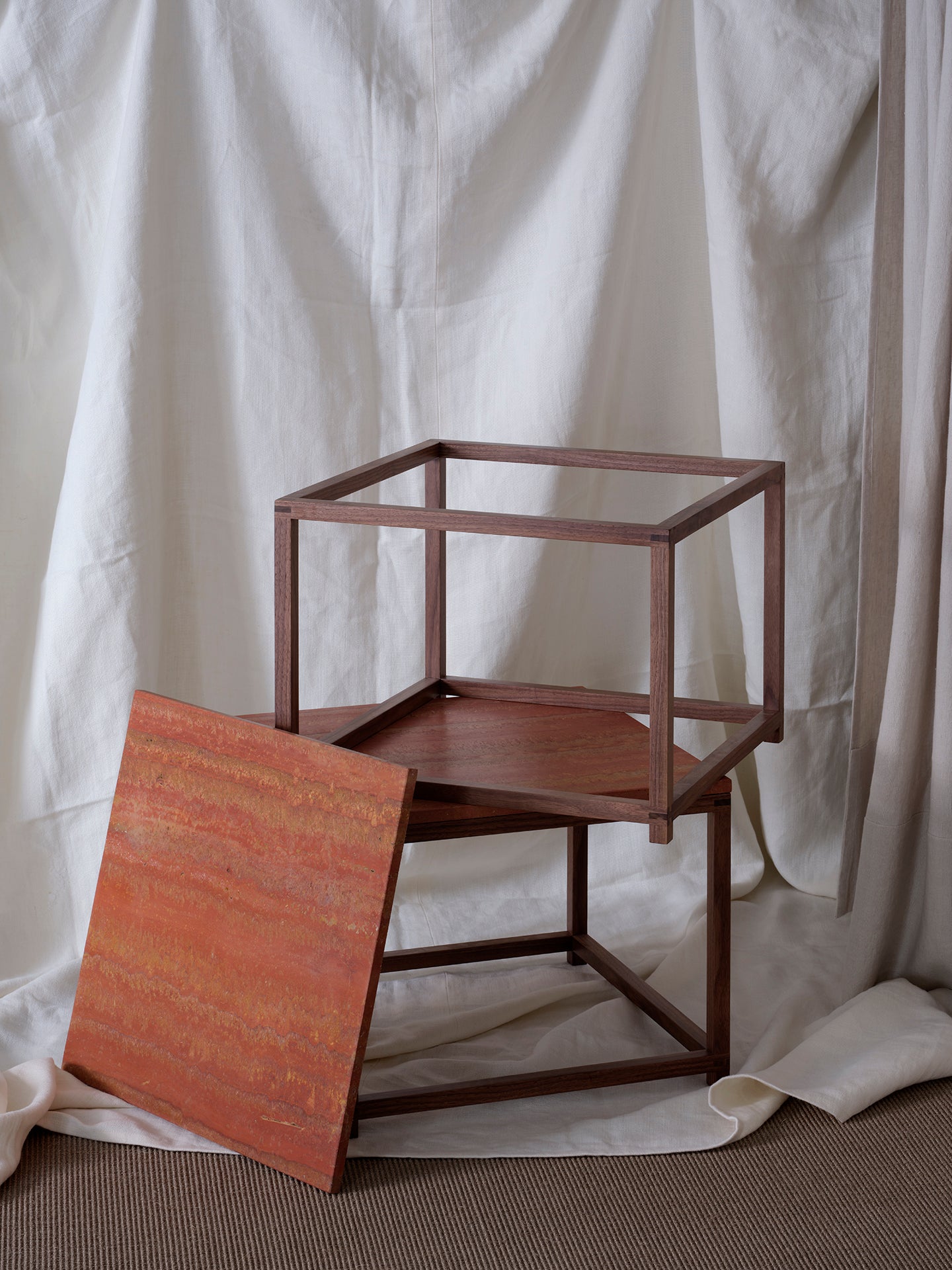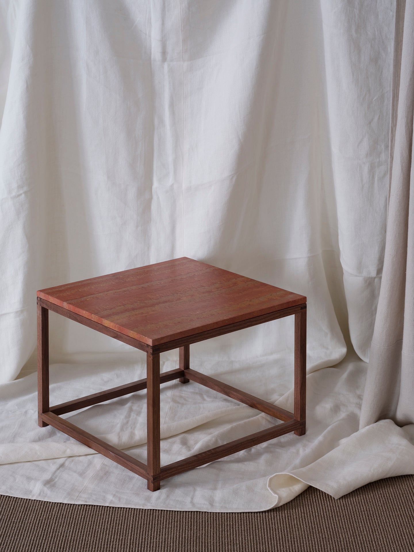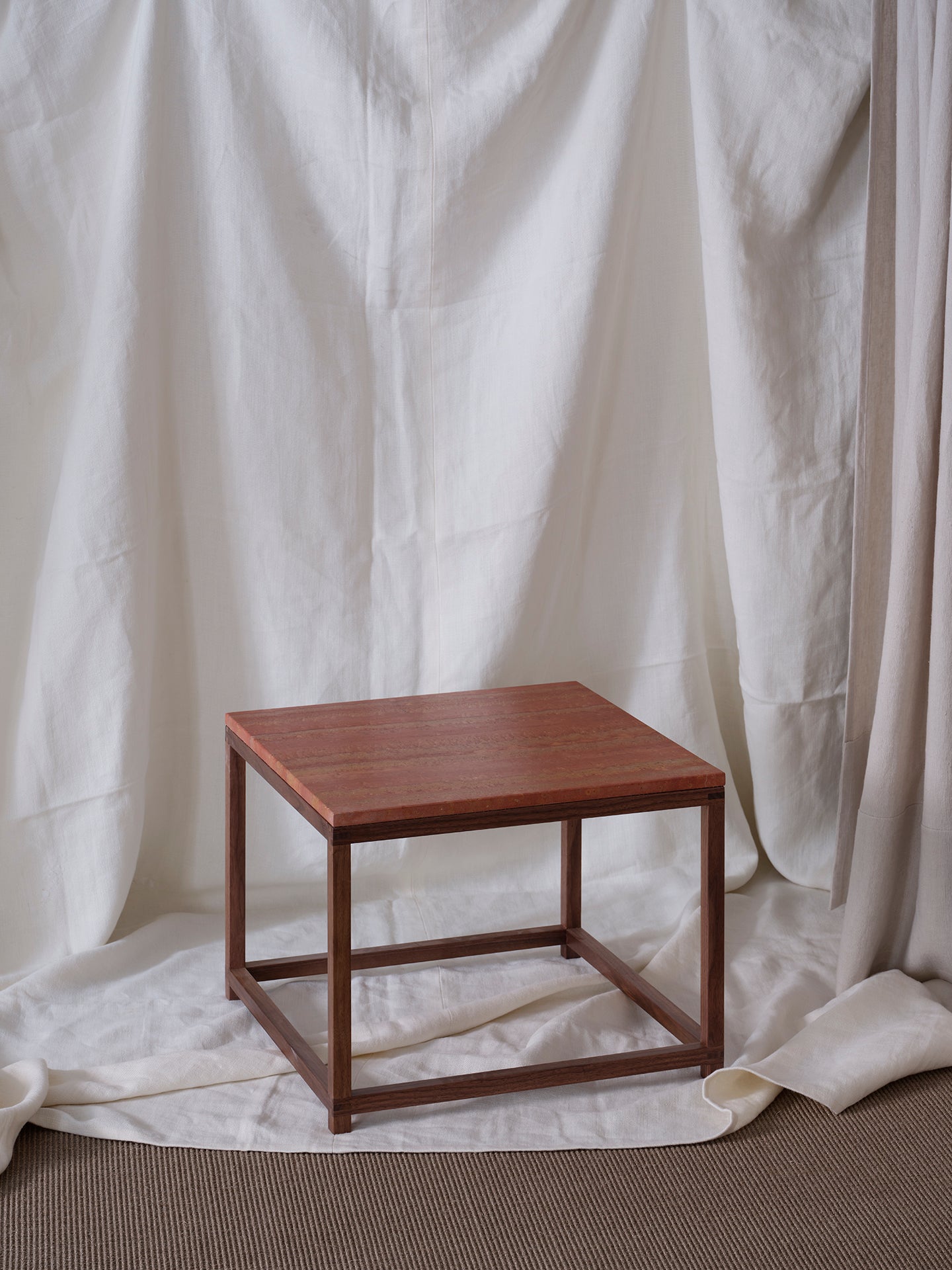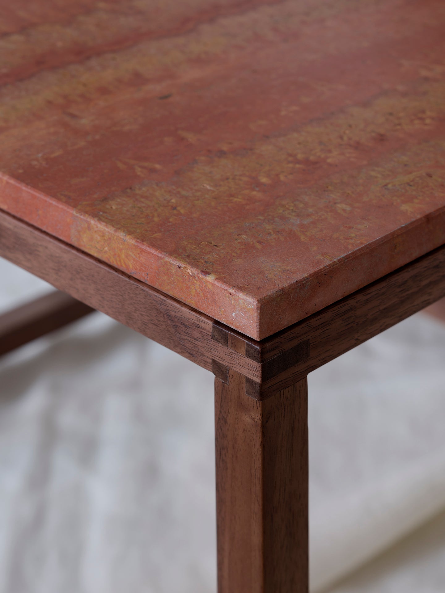Mesa auxiliar de formato cuadrado hecha en piedra de acabado apomazado apoyada sobre base de madera de nogal maciza ensamblada en acabado mate.