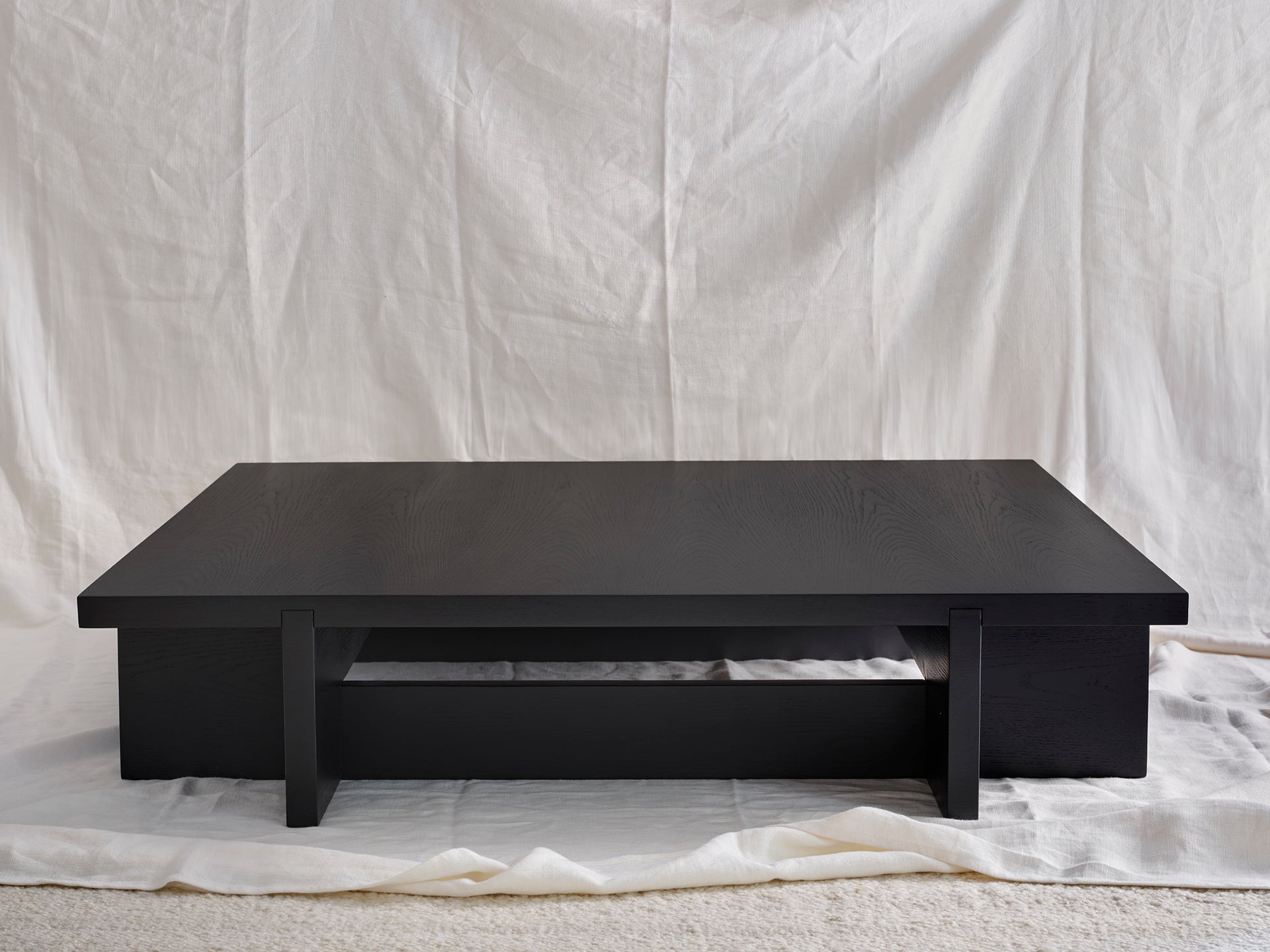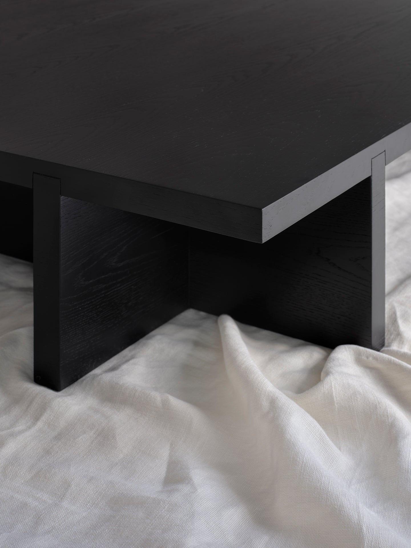 Mesa de centro de formato cuadrado. Las patas son cuatro piezas idénticas invertidas sobre las que apoya el tablero. Destaca el detalle visible del encaje del sobre con la base. La madera es en acabado mate.