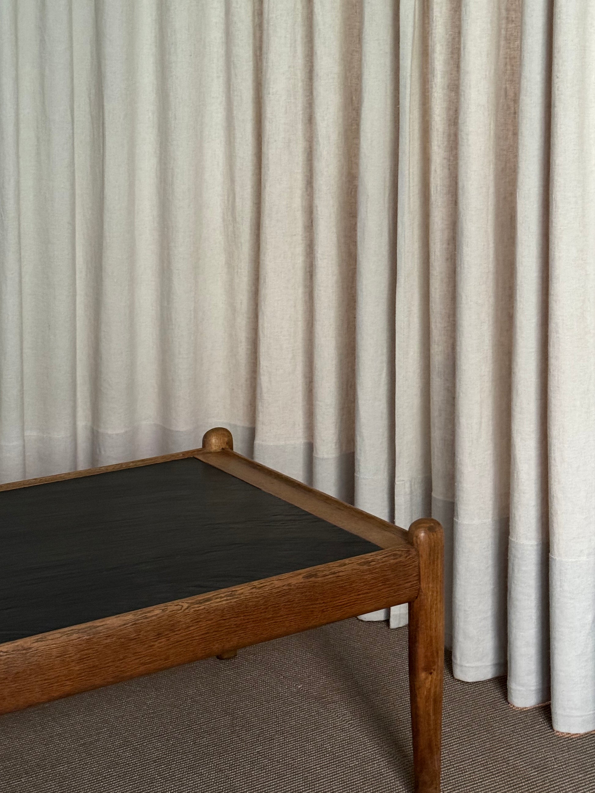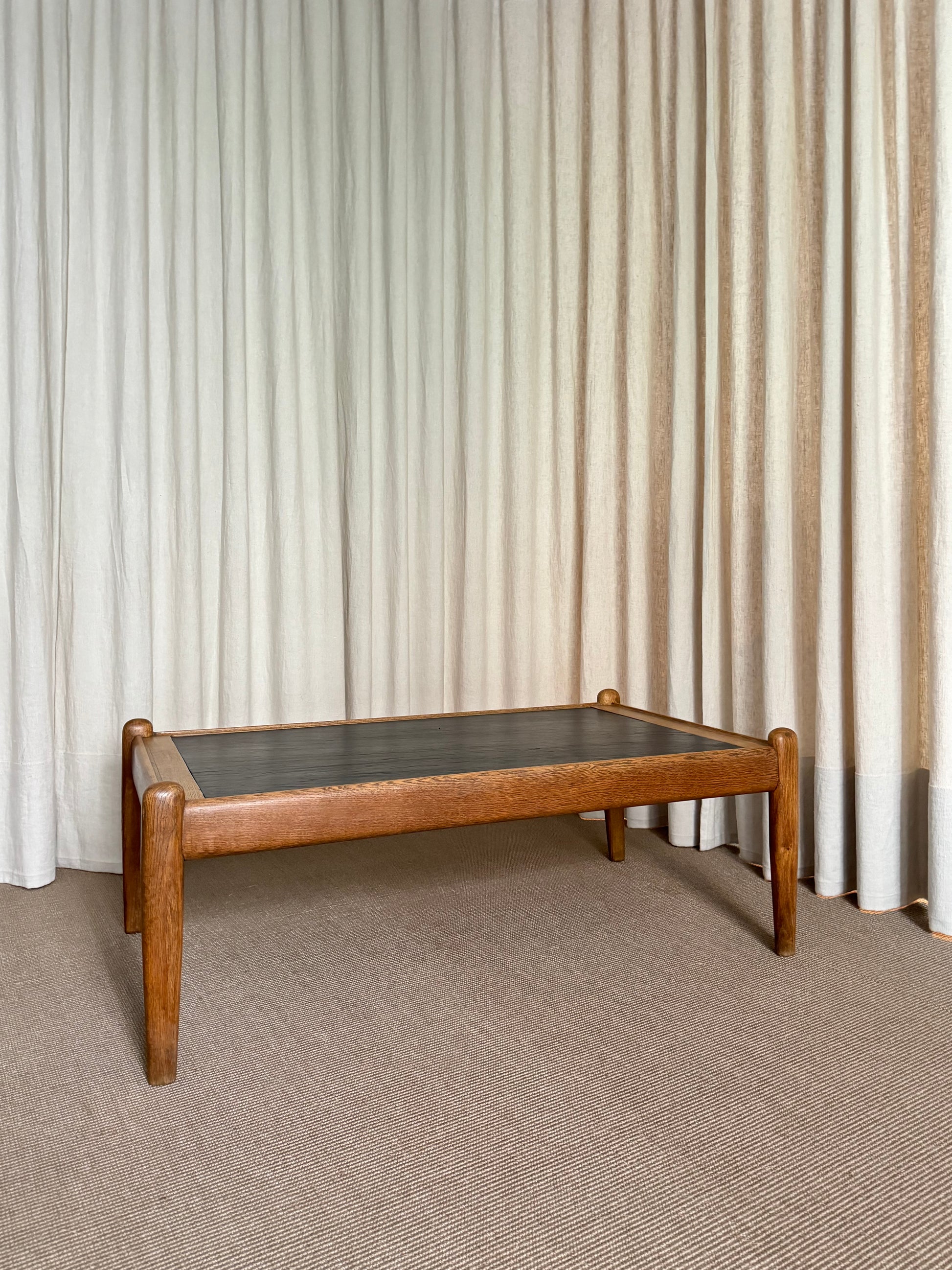 Mesa de centro de formato rectangular con estructura en madera de roble de 4 apoyos y sobre de encaje en pizarra. Escandinavia, años 1960s.