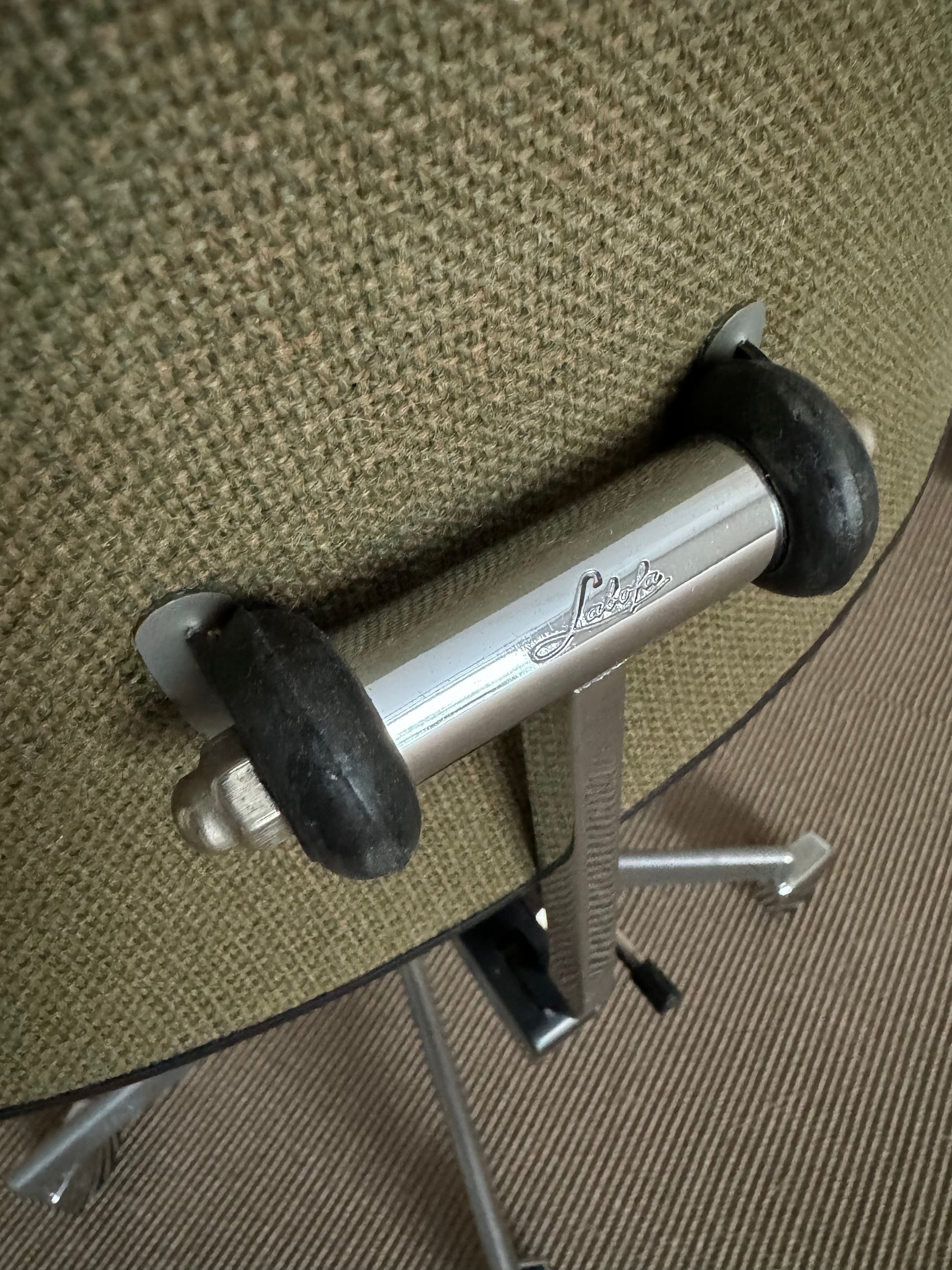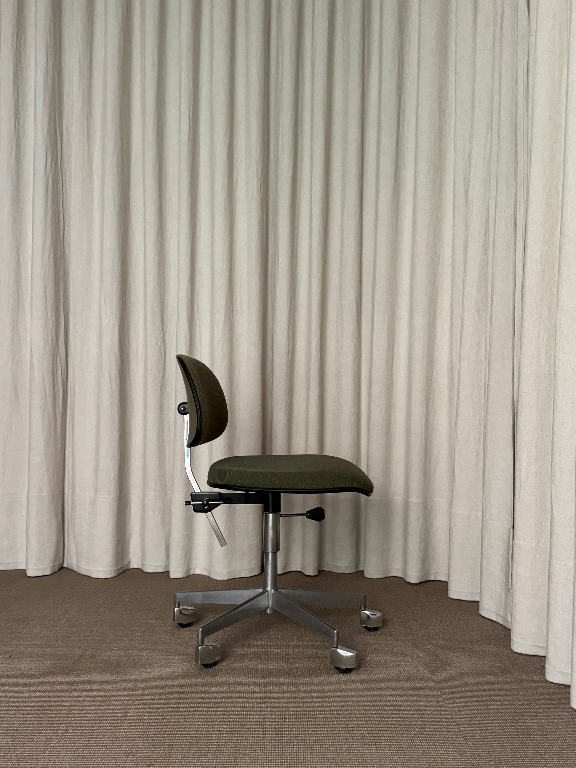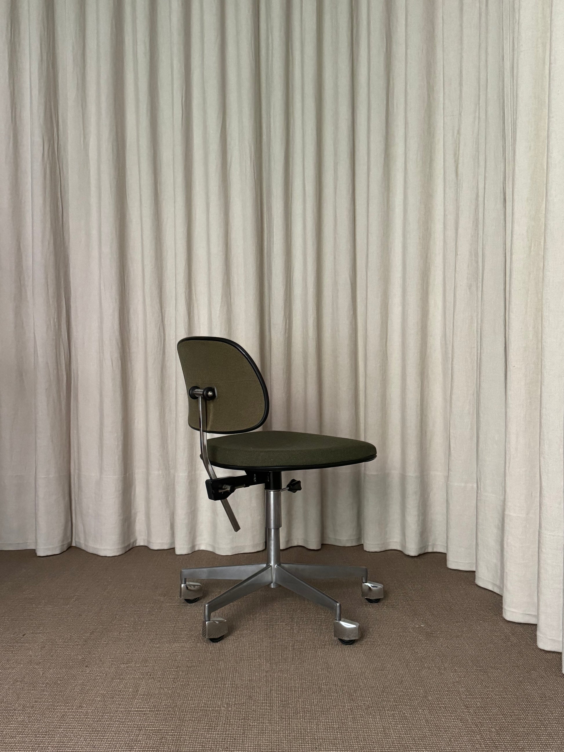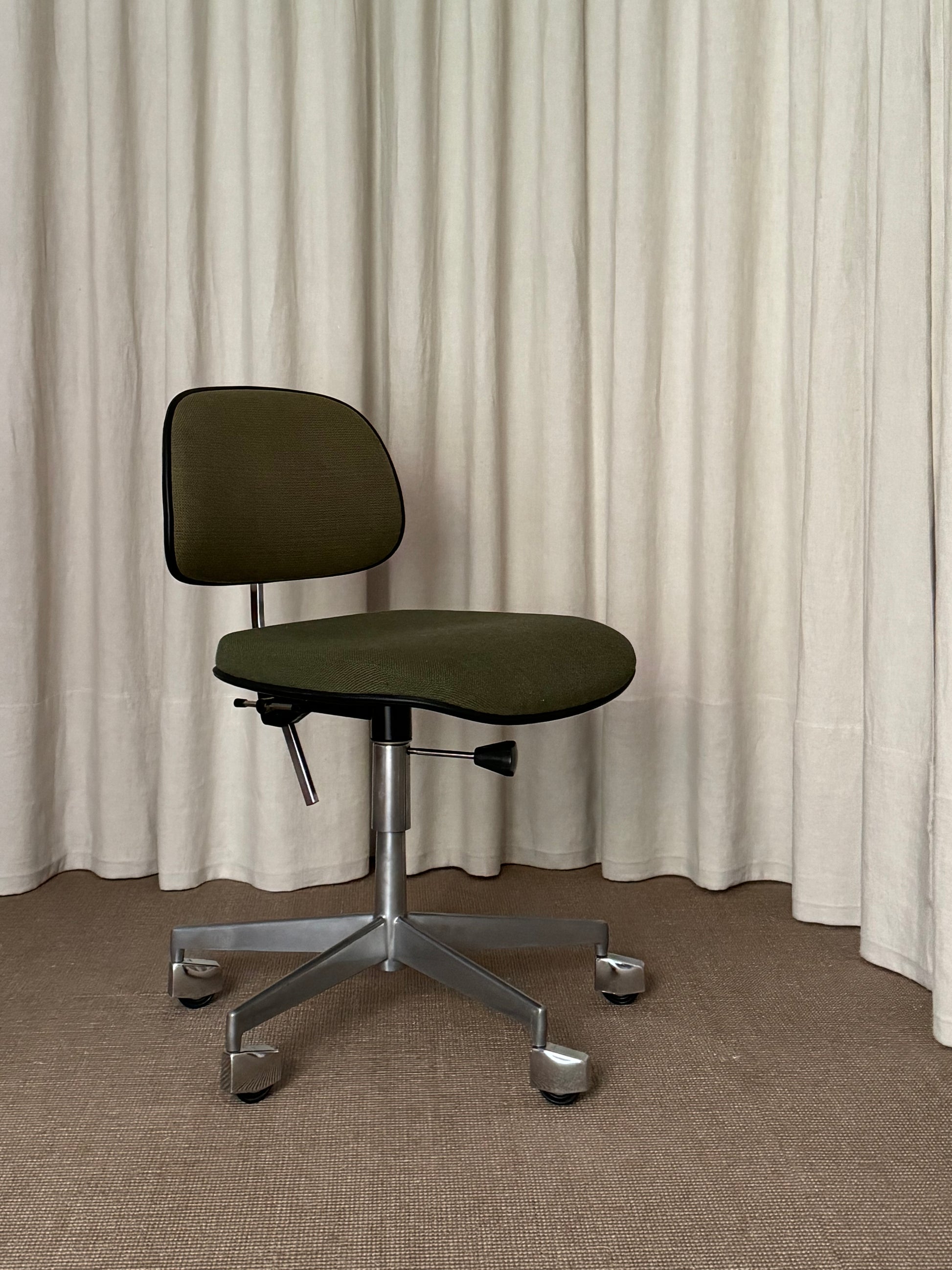 Silla de escritorio con base giratoria y ruedas revestidas de aluminio pulido. Asiento y resplado tapizados en tejido verde y de alturas regulables. Marca Labofa, Dinamarca, años 1960s.